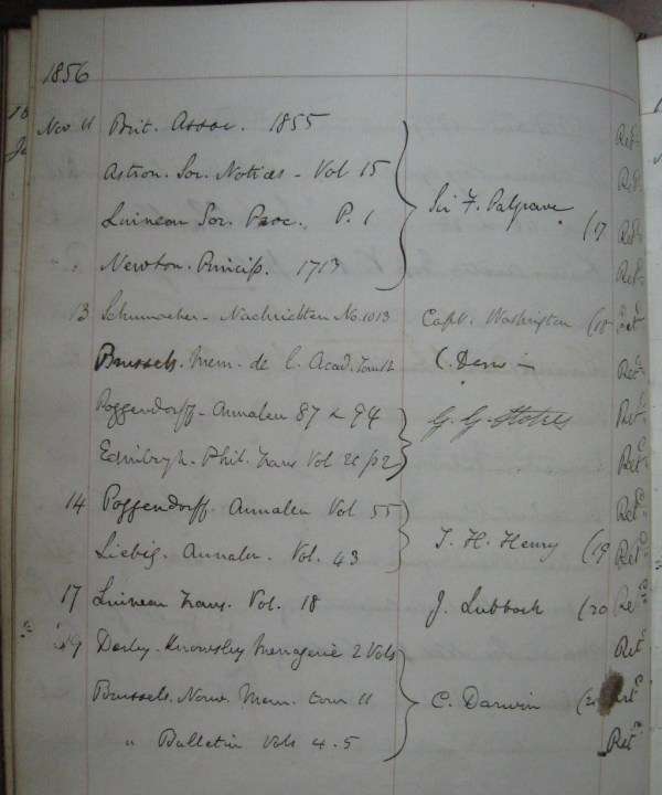 Another name that appears very frequently is C. Darwin. Darwin was elected as a Fellow in January 1839, and his first entry in the lending register appears in April 1839, when he borrowed volume 4 of the Transactions of the Geological Society. He obviously found the Royal Society’s library collection a useful resource, because over the years to 1860 he borrowed books and sets of journal volumes on more than 120 occasions (and more after that date – I just haven’t counted them yet). The Society’s library gave him access to foreign journals, including the publications of the St Petersburg Academy (now the Russian Academy of Sciences), Berlin’s Königliche Akademie der Wissenschaften (Royal Academy of Sciences), and the Brussels Académie Impériale et Royale des Sciences et Belles-Lettres. Darwin also borrowed travel books, some dating back to the 18th century. These included Constantine Phipps’s A Voyage towards the North Pole undertaken by His Majesty’s Command 1773 (London, 1774), which contained the first European description of the polar bear. Occasionally Darwin borrowed much older volumes, including Francis Willughby’s Ornithology, published in 1678, and the Italian Renaissance naturalist Ulisse Aldrovandi’s works on birds (1599) and quadrupeds (1637).